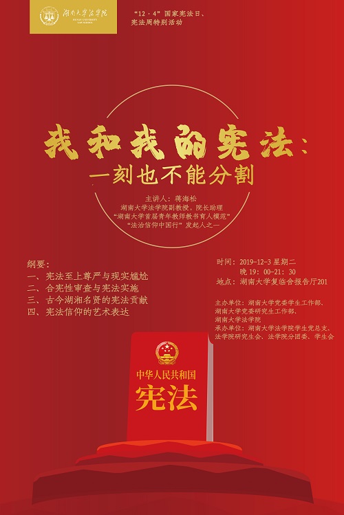 2019年12月3日晚,为迎接第六个国家宪法日,“我和我的宪法,一刻也不能分割”主题讲座在英国上市官网365复临舍报告厅成功举办。讲座邀请了英国365集团公司院长助理、“法治信仰中国行”发起人之一蒋海松副教授主讲。讲座由英国上市官网365党委学生工作部、党委研究生工作部、英国365集团公司主办,英国365集团公司党总支、研究生会、分团委、学生会承办,来自英国上市官网365、中南大学、湖南师范大学、湖南工商大学等高校师生、湖南省司法实务界人士等两百多人参加讲座。