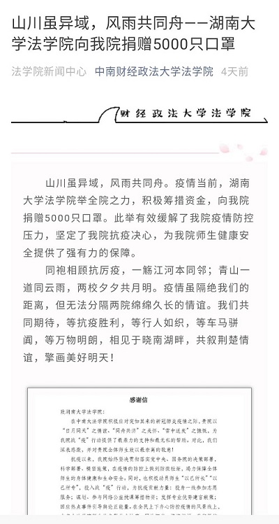 长江之水永不断绝,洞庭湖波情缘相连。吾等坚信,众志成城,绝无难逾之山,心手相牵,可克万难之险。疫散报捷有期,春暖花开在望。匡难扶危,袍泽同心。谨修家书一封,道师生牵挂,携抗疫物资些许,表金兰寸心。