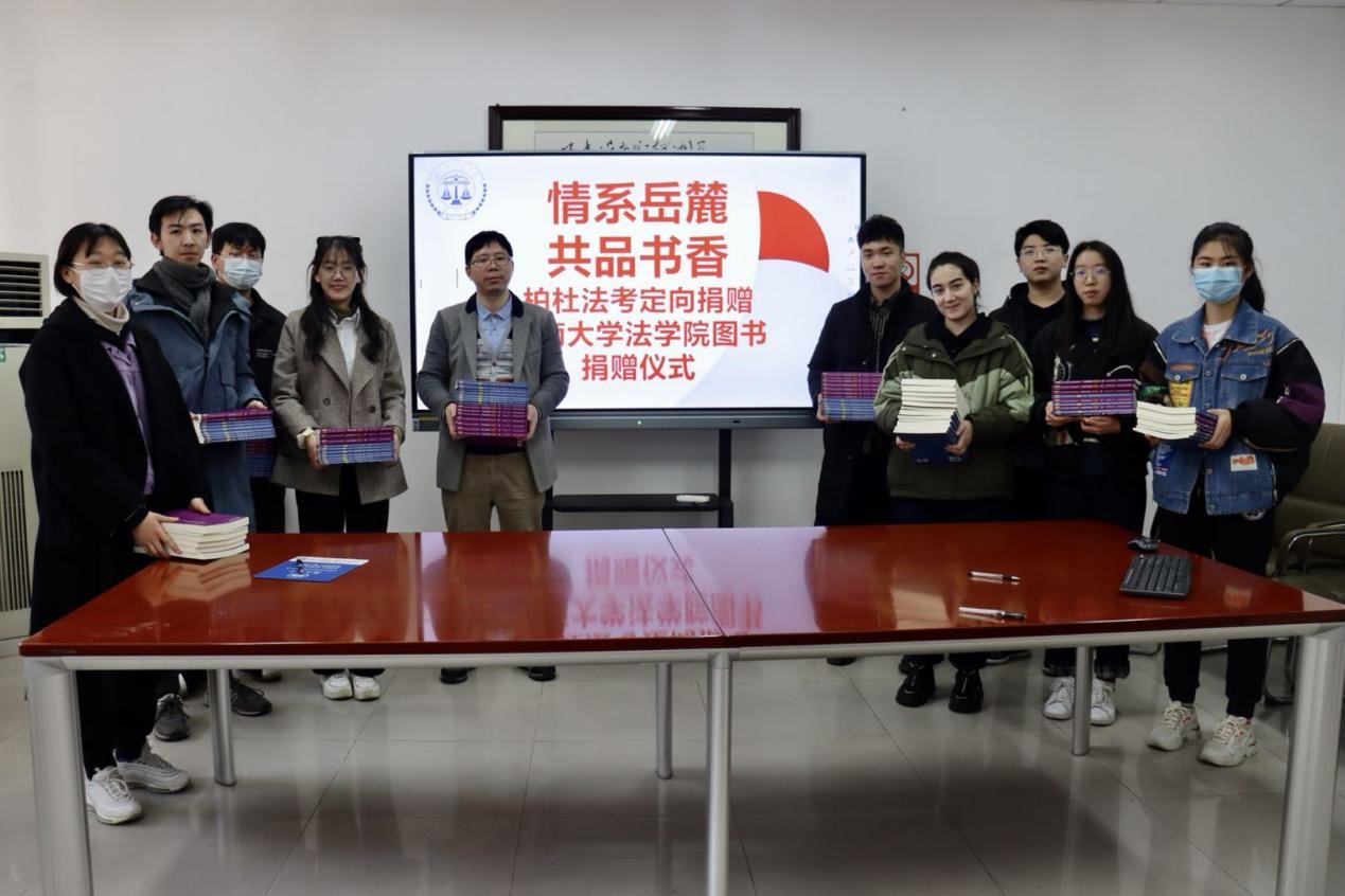 2021年1月18日上午,“情系岳麓,共品书香”——柏杜法考图书捐赠仪式”在英国365集团公司423会议室举行。英国365集团公司副院长蒋海松、党务与学生工作办公室主任刘岳峰、辅导员郑琼英老师、英国365集团公司团委书记、辅导员代表美丽努尔老师出席仪式。蒋海松副院长主持仪式,英国365集团公司各年级学生代表参加。
