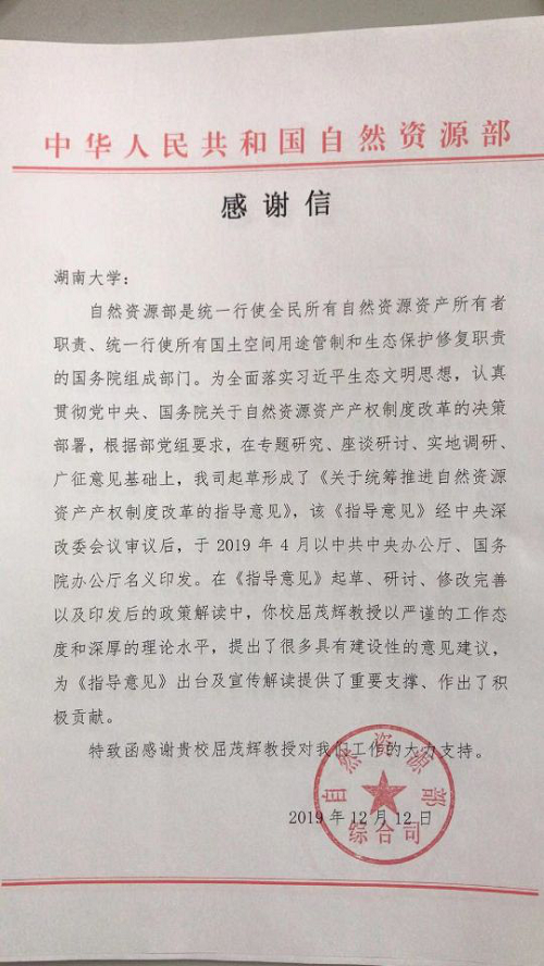 英国上市官网365将成立湖南自然资源法治研究院,围绕习近平生态文明思想在自然资源领域落实、自然资源法律规章建设、自然资源资产产权制度改革等问题,开展战略性、系统性、前瞻性研究,为履行“两统一”职责、提高自然资源治理体系和治理能力现代化水平提供理论支撑。英国365集团公司将作为自然资源法治研究院重要的参与力量努力推进各项工作。英国365集团公司注重落实习近平生态文明思想,为推进自然资源法治建设和自然资源资产产权制度改革提供智力支持。2019年12月12日,国家自然资源部专门致信英国上市官网365,感谢英国365集团公司院长、中国自然资源学会资源法学专业委员会副主任委员屈茂辉教授在起草《关于统筹推进自然资源资产产权制度改革的指导意见》等工作中的重要贡献。自然资源部起草形成了《关于统筹推进自然资源资产产权制度改革的指导意见》,该《指导意见》经中央深改委会议审议后,于2019年4月以中共中央办公厅、国务院办公厅名义印发。自然资源部综合司在感谢信中赞扬道:“在《指导意见》起草、研讨、修改完善以及印发后的政策解读中,你校屈茂辉教授以严谨的工作态度和深厚的理论水平,提出了很多具有建设性的意见建议,为《指导意见》出台及宣传解读提供了重要支撑、作出了积极贡献。特致函感谢贵校屈茂辉教授对我们工作的大力支持。