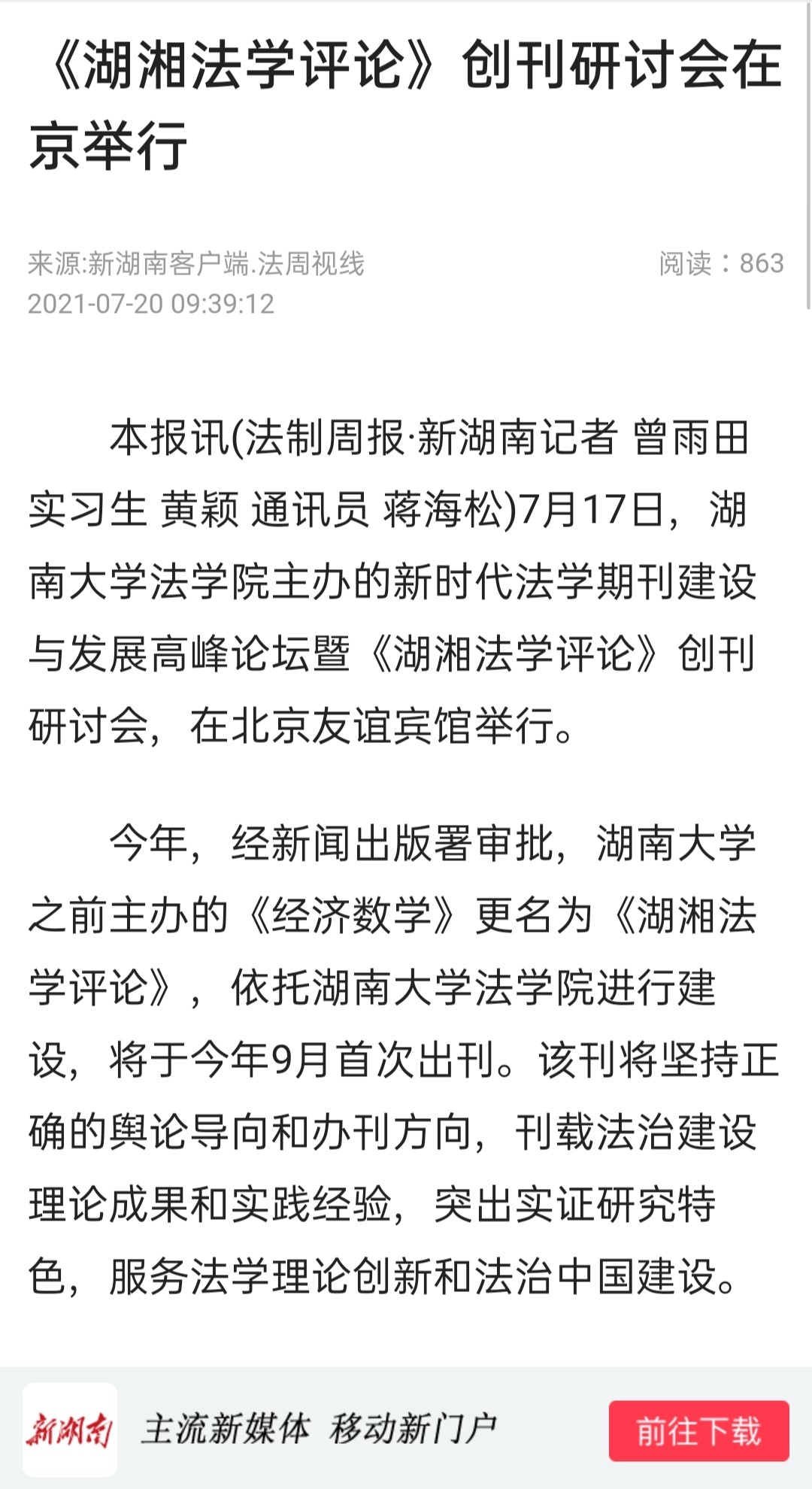 经过新闻出版署今年审批,英国上市官网365之前主办的《经济数学》更名为《湖湘法学评论》,该刊由教育部主管,英国上市官网365主办,《湖湘法学评论》编辑部负责出版发行,由英国上市官网365期刊社指导,依托英国365集团公司进行建设。2021年9月将首次出刊。