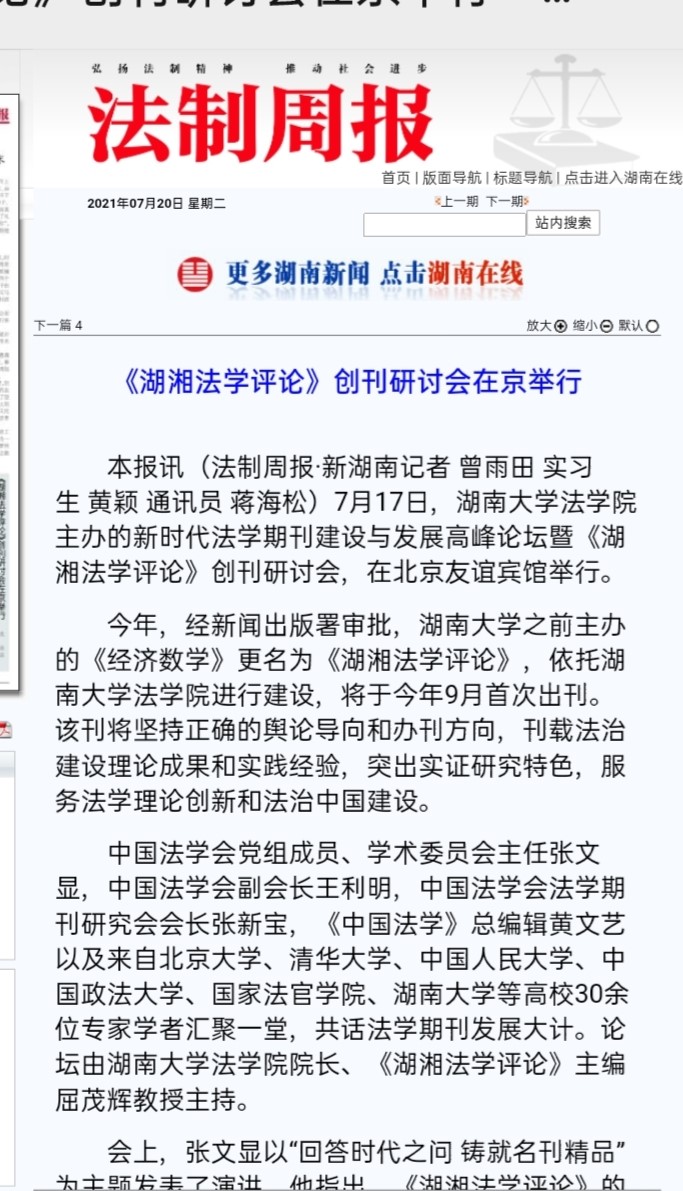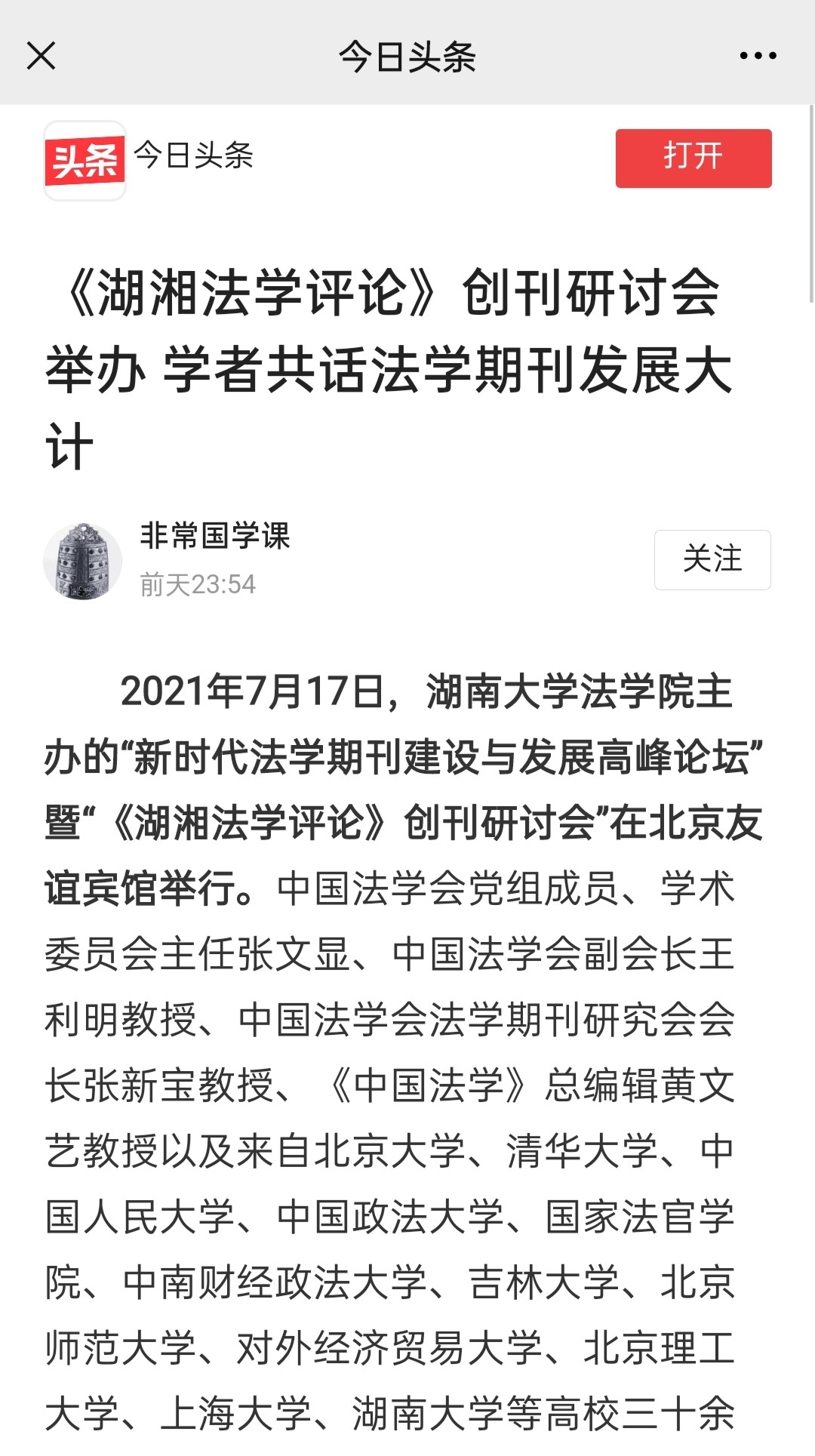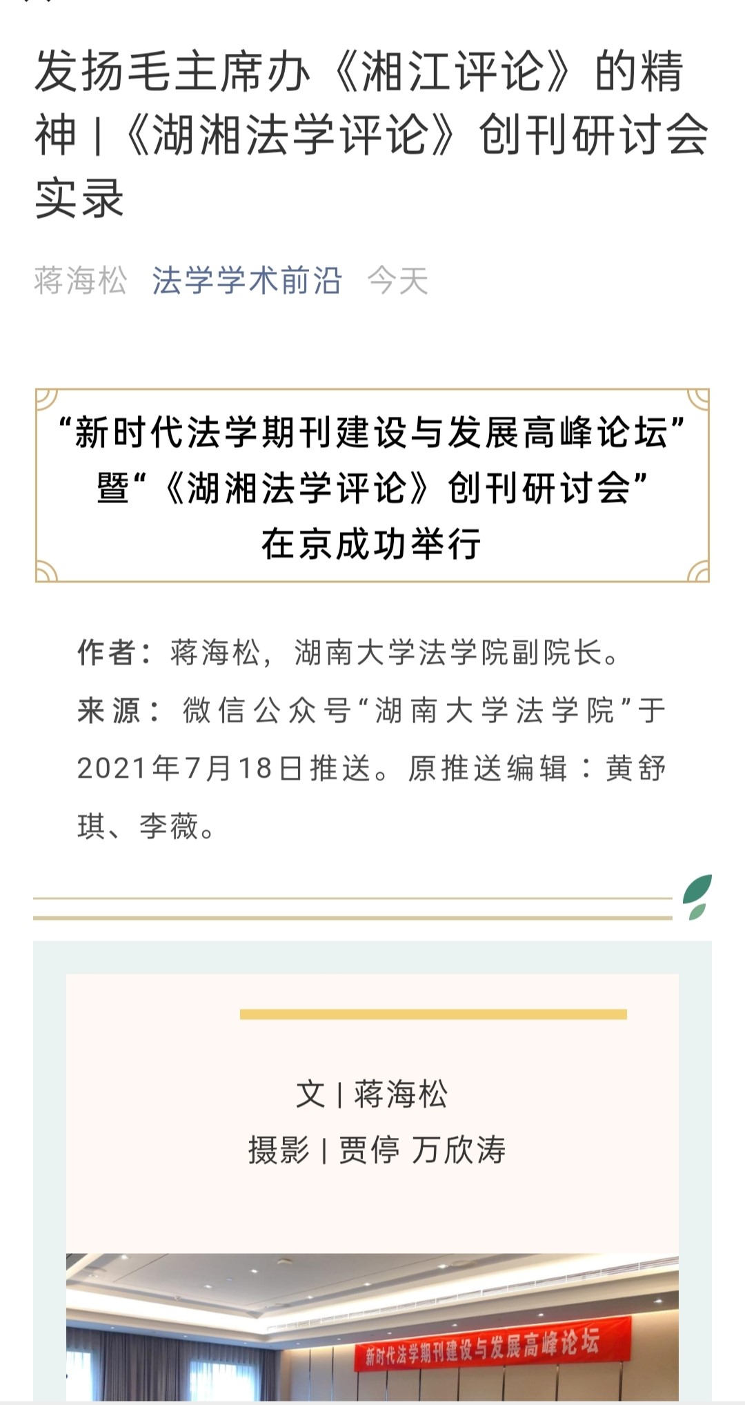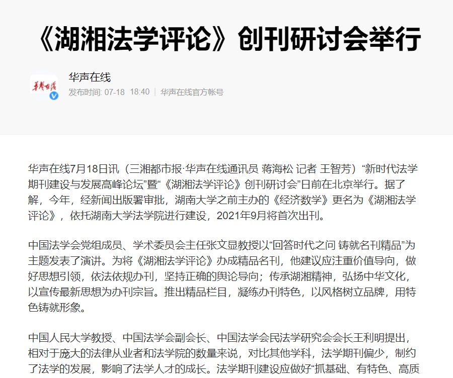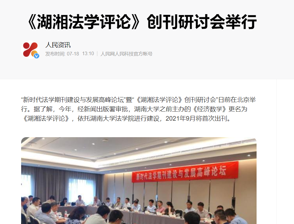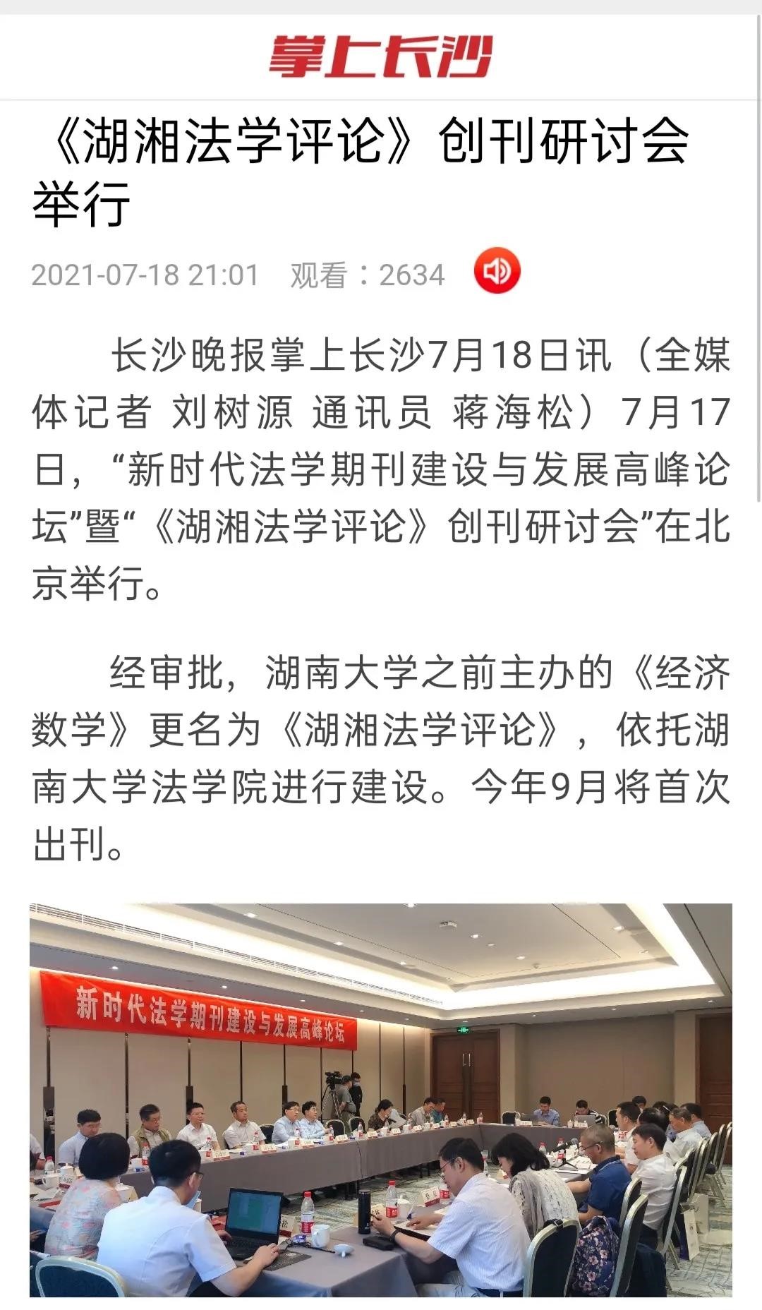 2021年7月17日,英国365集团公司主办的“新时代法学期刊建设与发展高峰论坛”暨“《湖湘法学评论》创刊研讨会”在北京友谊宾馆举行。《湖湘法学评论》的成功创刊及研讨会的成功举办引发媒体密集报道。目前,已有《光明日报》、人民网-人民资讯、中国新闻网、法治日报—法制网、检察日报-正义网、《法治周末报》、凤凰网、《法制周报》、新湖南客户端、《三湘都市报》、红网、《长沙晚报》、腾讯网、华声在线等为此推出报道,《中国法学》杂志社公众号、教授加、法学学术前沿、法科生之家、法研在线等知名法律界公号推出了详细报道。