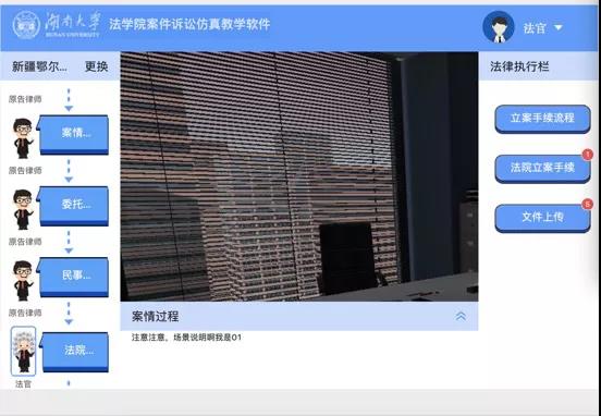邱昌茂老师向来宾介绍了由我院打造的卓越法治人才教育培养基地法律虚拟仿真实验室项目。我院模拟庭审虚拟仿真实验教学系统,借助WEB、Unity3D、GL、信息技术等虚拟仿真三维建模与交互技术手段,真实还原民事诉讼的全过程,基于司法实践中的真实案例,学生可选择从不同角度参与演练,复习实体法和程序法知识,真正做到学以致用。