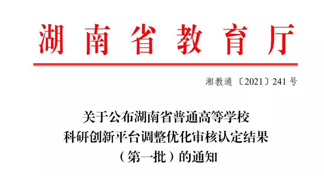 为推动高校主动对接服务“三高四新”战略和地方经济社会发展,湖南省教育厅对2004至2019年立项的所有湖南省高校科研创新平台进行了调整优化,淘汰了一批平台。遵循“凝练方向、优化队伍、整合资源”原则,经平台申请、学院把关、专家评议、学术委员会评审、学校推荐、教育厅审核等各个环节,确立了调整优化后的第一批湖南省普通高等学校科研创新平台。本次我院平台的顺利入选,体现了学院在业内的影响力。