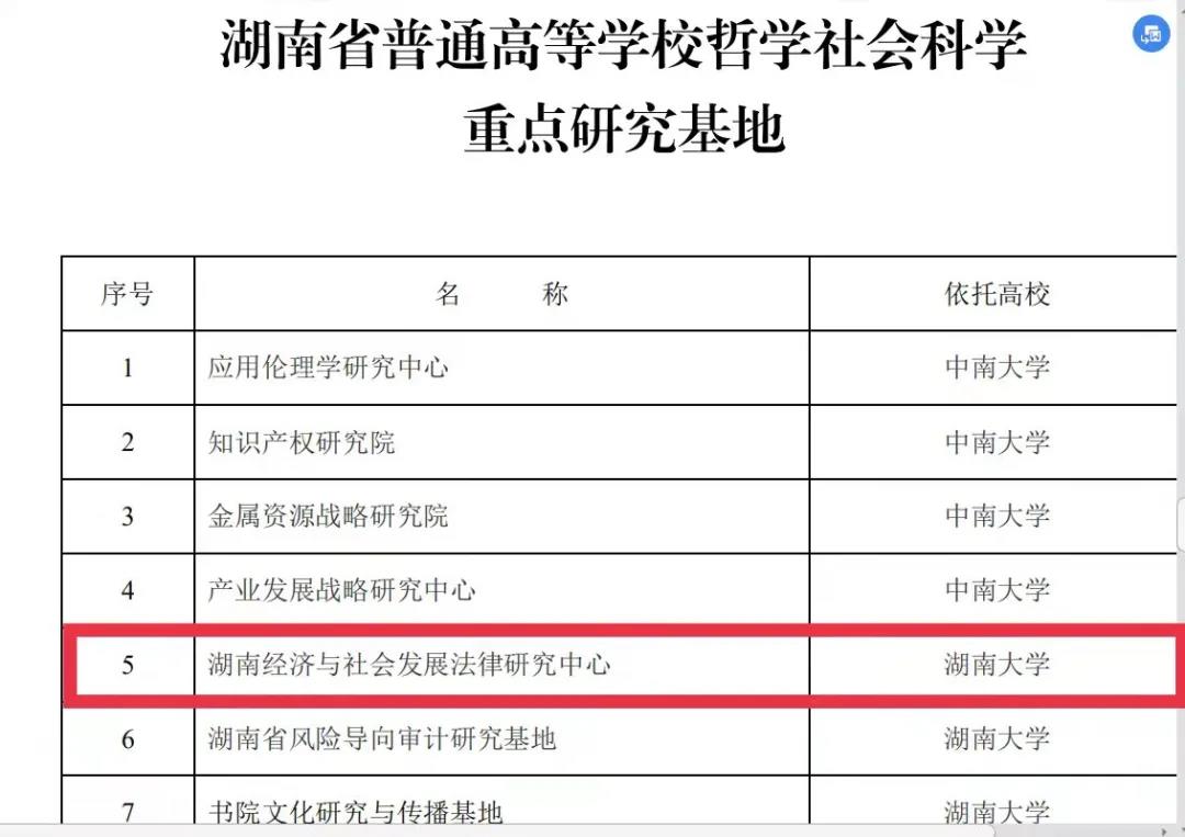 2021年,湖南省普通高等学校科研创新平台调整优化审核结果公布,我院“湖南经济与社会发展法律研究中心”顺利入选调整优化后首批湖南省哲学社会科学重点研究基地 。
