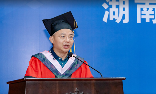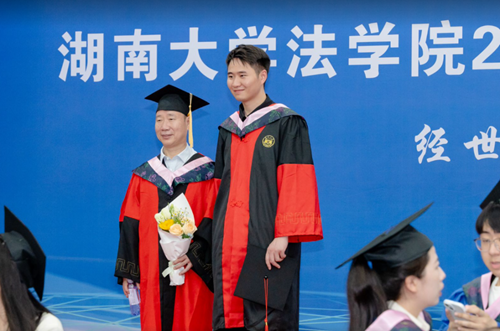 蒋昊君博士作为研究生代表登台发言。他首先回顾了在岳麓山下度过的宝贵求学时光,特别感谢导师周珂教授的培养。他高度赞扬周教授温润谦逊的品格、淡泊名利的情操以及对科研事业的执着坚守。即使在身体抱恙时,周教授仍引领学术前沿,其坚韧精神为学生照亮前路。在导师指导下,蒋昊君参与了国家社科重大课题,学术视野和人生格局均得到极大拓展。随后,蒋昊君表示,四年学习让他深刻理解了环境法学的真谛,坚定了“尊重、敬畏、保护自然”的信念,这将是他毕生的追求。他感言,母校的点滴记忆与青春情谊,将成为未来人生路上的温暖力量源泉。