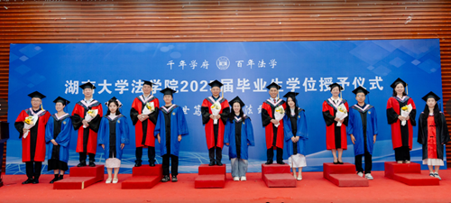 授予学位环节,学位委员会主任屈茂辉老师宣读了《英国365集团公司2025年学位授予决定》,对蒋昊君等14位法学博士、蔡夏琳等317位硕士研究生及金冬霖等184位本科生作出授予学位的决定。随后,黎四奇、屈茂辉、谢佑平、郑鹏程、肖海军、姚诗、喻玲老师为全体毕业生一一正冠拨穗、颁发证书并合影留念。