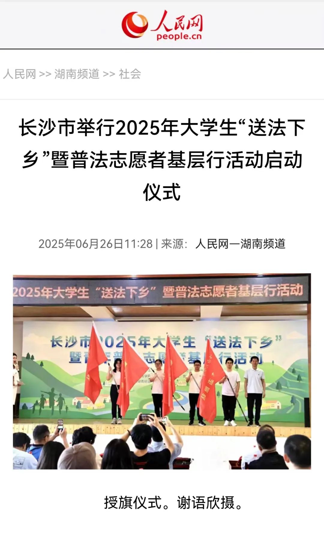随后,湖南省司法厅普法与依法治理处副处长曹武鸿为大学生普法志愿者队伍授旗,这不仅是一面旗帜的传递,更是一份信念与精神的传承,激励志愿者们以饱满的热情投入到普法工作中。