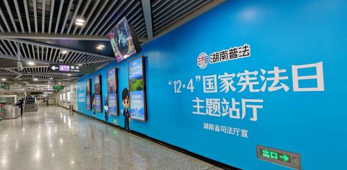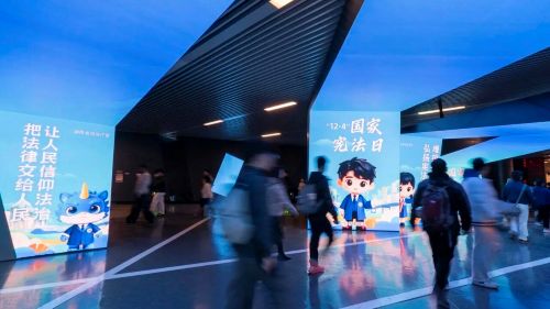 长沙地铁数字艺术馆宪法主题动态光影展,以司法行政蓝为主色调,运用LED大屏和AI等前沿技术,生动展现湖南普法的“如法少年”形象,弘扬宪法精神,打造沉浸式的宪法精神宣传空间。