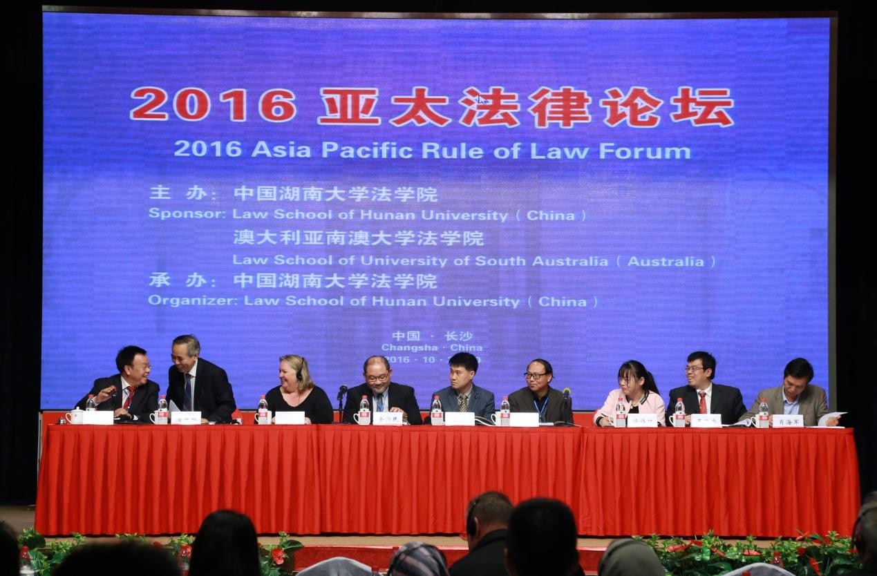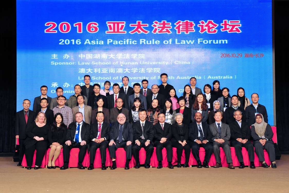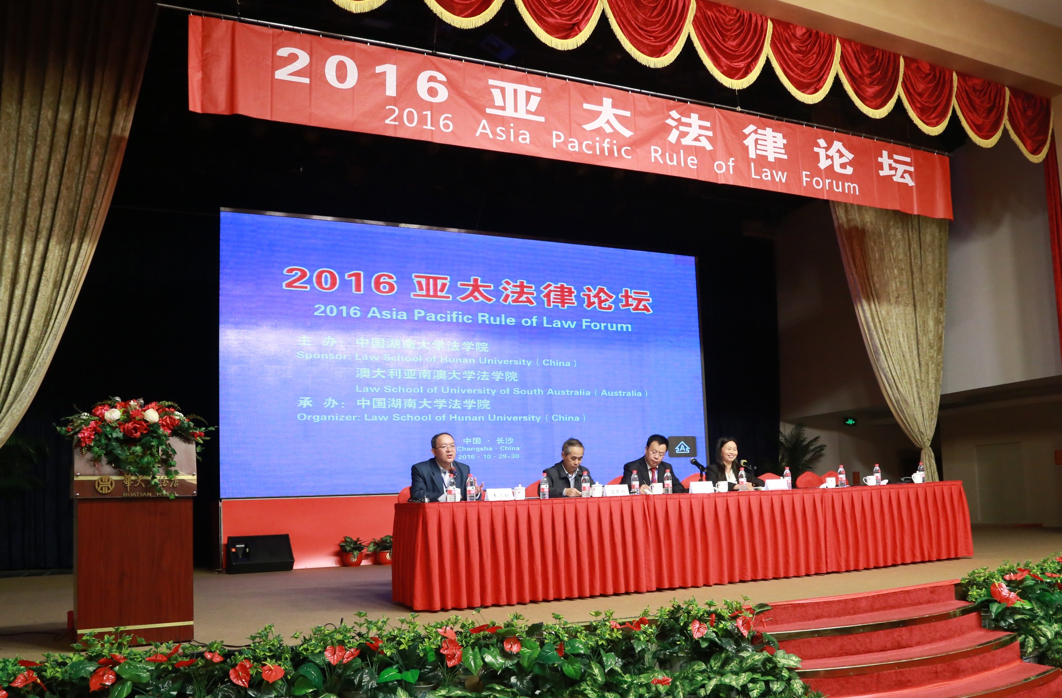 2016年10月29日至30日,由英国365集团公司与澳大利亚南澳大学英国365集团公司共同主办、英国365集团公司轮值承办的“2016亚太法律论坛”在长沙华天大酒店召开。来自澳大利亚南澳大学、马来西亚国立大学、美国凯特林大学、英国班戈大学、韩国忠北大学、我国台湾地区东吴大学、中南财经政法大学、湘潭大学、中南大学、湖南科技大学、英国上市官网365等海内外高校和司法系统逾39位专家学者与会。湖南省高级人民法院副院长、审判委员会委员、一级高级法官杨翔;中国政法大学副校长时建中教授;英国上市官网365党委副书记陈伟教授;当代法学名家英国365集团公司王晓晔教授;英国365集团公司院长屈茂辉教授等学者和专家出席了会议。