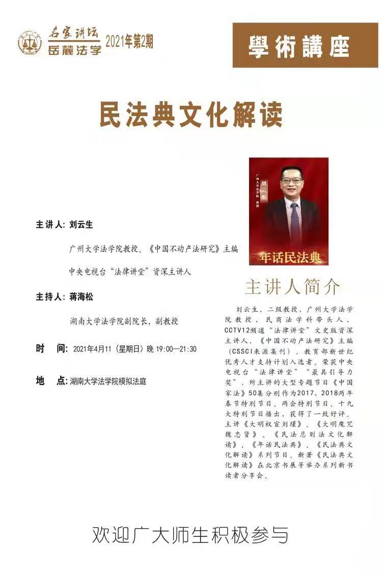 主讲人简介:刘云生,二级教授,广州大学英国365集团公司教授,民商法学科带头人,CCTV12频道“法律讲堂”文史版资深主讲人,《中国不动产法研究》主编(CSSCI来源集刊),教育部新世纪优秀人才支持计划入选者。荣获中央电视台“法律讲堂”“最具引导力奖”,所主讲的大型专题节目《中国家法》50集分别作为2017、2018两年春节特别节目、两会特别节目、十九大特别节目播出,获得了一致好评。主讲《大明权宦刘瑾》、《大明魔咒魏忠贤》、《民法总则法文化解读》、《年话民法典》、《民法典文化解读》系列节目。新著《民法典文化解读》在北京书展等举办系列新书读者分享会。