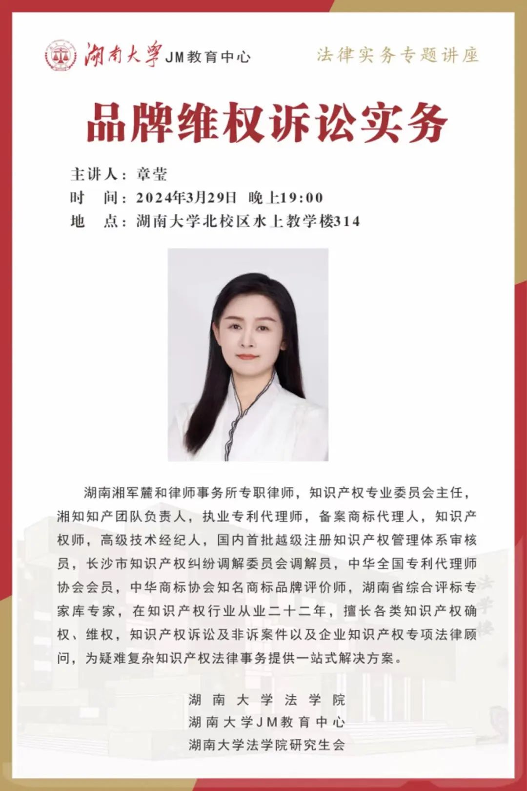 本次JM实务讲座邀请到湖南湘军麓和律师事务所律师章莹为大家讲述品牌维权诉讼实务,帮助大家了解相关实务问题,欢迎同学们积极参与!