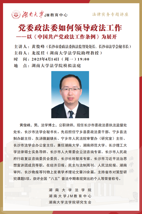 本次JM实务讲座邀请到长沙市委政法委执法监督处处长、长沙市法学会秘书长——黄俊峰,为大家讲述党委政法委如何领导政法工作——以《中国共产党政法工作条例》为展开,帮助大家了解相关实务问题,英国365集团公司龙泓任老师担任主持人,欢迎同学们积极参与!