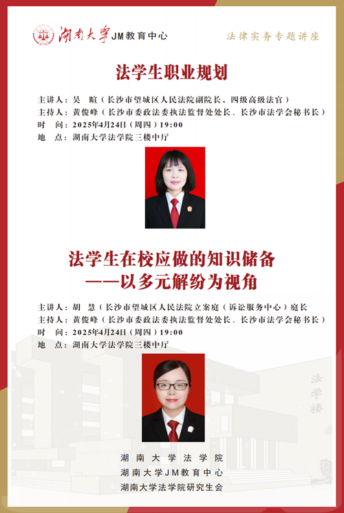 本次JM实务讲座邀请到长沙市望城区人民法院副院长,四级高级法官——吴暄和长沙市望城区人民法院立案庭(诉讼服务中心)庭长,一级法官——胡慧,分别为大家讲述法学生职业规划以及学生在校应做的知识储备——以多元解纷为视角,帮助大家了解相关实务问题,长沙市委政法委执法监督处处长、长沙市法学会秘书长黄俊峰担任此次主持人,欢迎同学们积极参与!