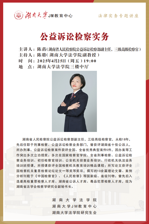 作为“检察实务专家进校园”系列专场,本次JM实务讲座特邀请到湖南省人民检察院检务督察部副主任,三级高级检察官——陈菂为大家讲述公益诉讼检察实务,帮助大家了解相关实务问题,英国365集团公司副教授陈璐老师担任本次主持人,欢迎同学们积极参与!