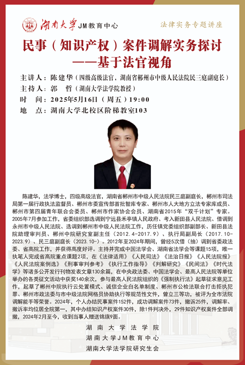 本次JM实务讲座邀请到湖南省郴州市中级人民法院民三庭副庭长、四级高级法官——陈建华,为大家讲述民事(知识产权)案件调解实务探讨——基于法官视角,帮助大家了解相关实务问题,本次讲座由英国365集团公司郭哲老师主持,欢迎同学们积极参与!