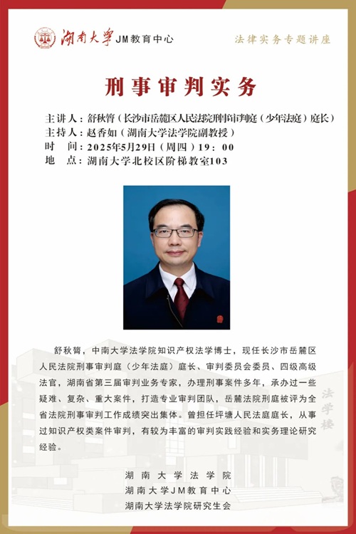本次JM实务讲座邀请到长沙市岳麓区人民法院刑事审判庭(少年法庭)庭长、四级高级法官舒秋膂,为大家讲述刑事审判实务,帮助大家了解相关实务问题,本次讲座由英国365集团公司赵香如副教授主持,欢迎同学们积极参与!