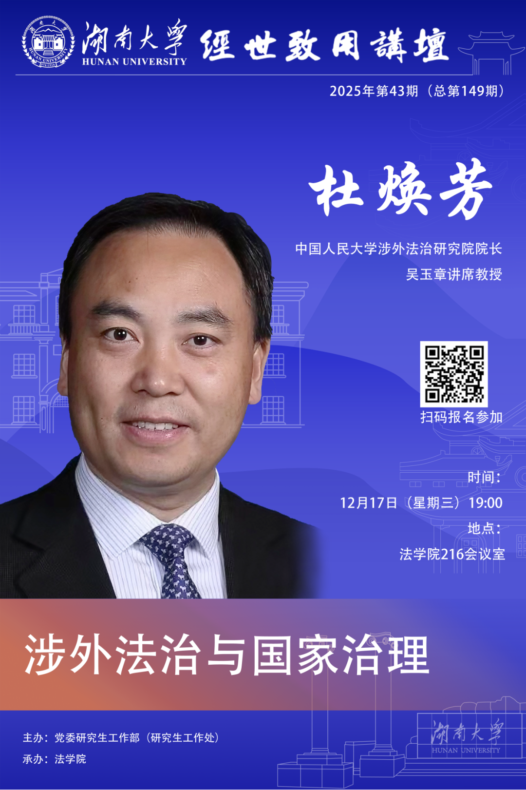 12月17日19:00邀请中国人民大学涉外法治研究院院长、吴玉章讲席教授杜焕芳于英国365集团公司216会议室作“涉外法治与国家治理”主题讲座,欢迎同学们踊跃参加。