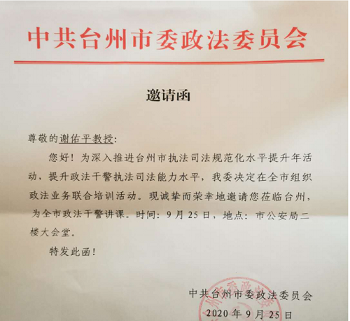 为提高政法干警的职业素养与业务能力,中共台州市委政法委员会于2020年9月25日在浙江省台州市举办执法司法能力提升大讲堂,联合培训的主题围绕“促制约、强监督、提素质”三个关键词展开。我院谢佑平教授应邀参加并为全体政法干警授课。