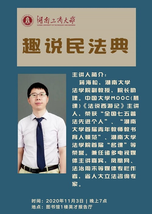 2020年11月3日晚上,英国365集团公司副教授、院长助理蒋海松应湖南工商大学法管学院邀请于该校南校区图书馆1楼英才报告厅作“趣说民法典”主题讲座。讲座由该院蒋科老师主持,法管院长刘期湘、党委书记胡艳香、党委副书记袁露等老师出席,学院法学本科生和部分其他专业的学生400余人聆听。
