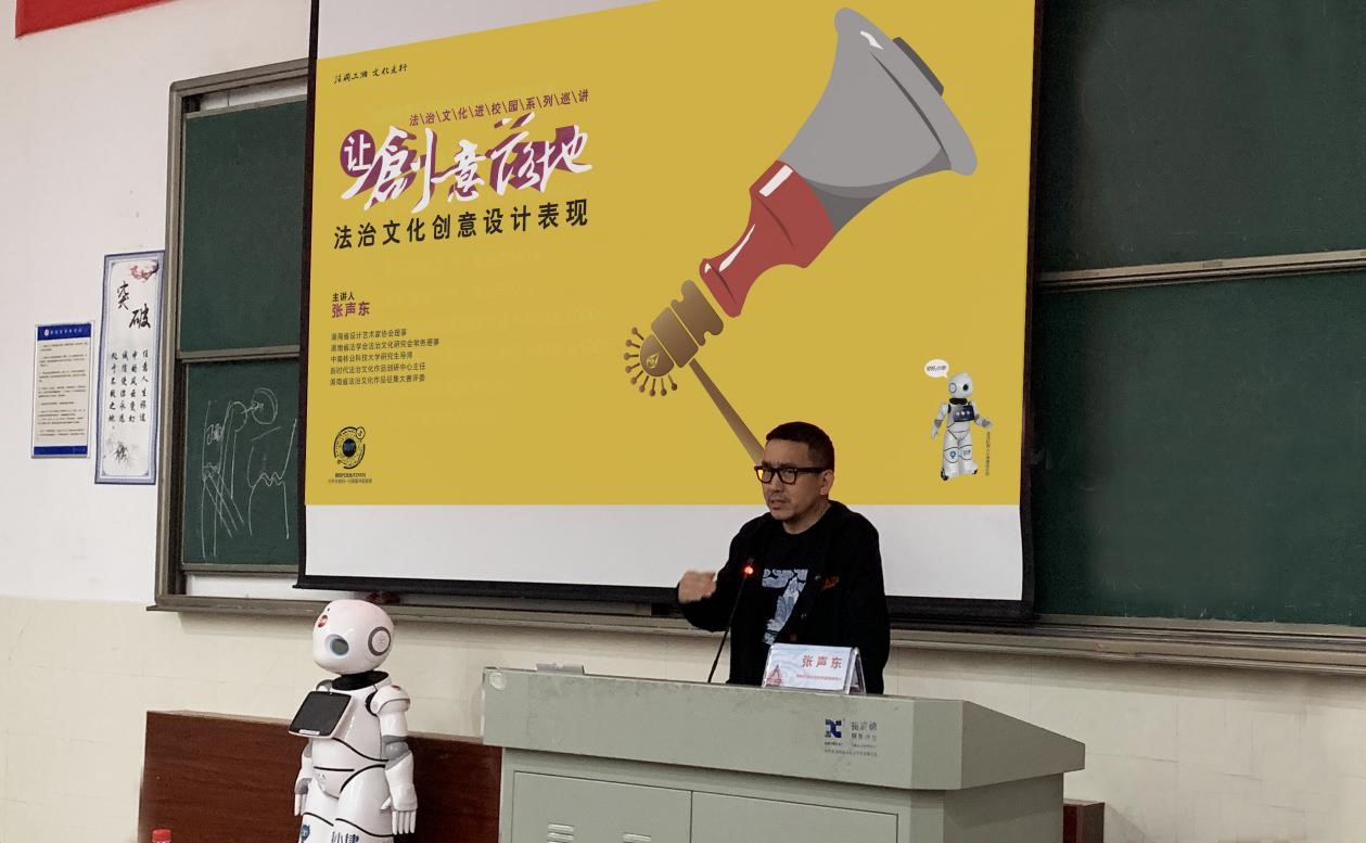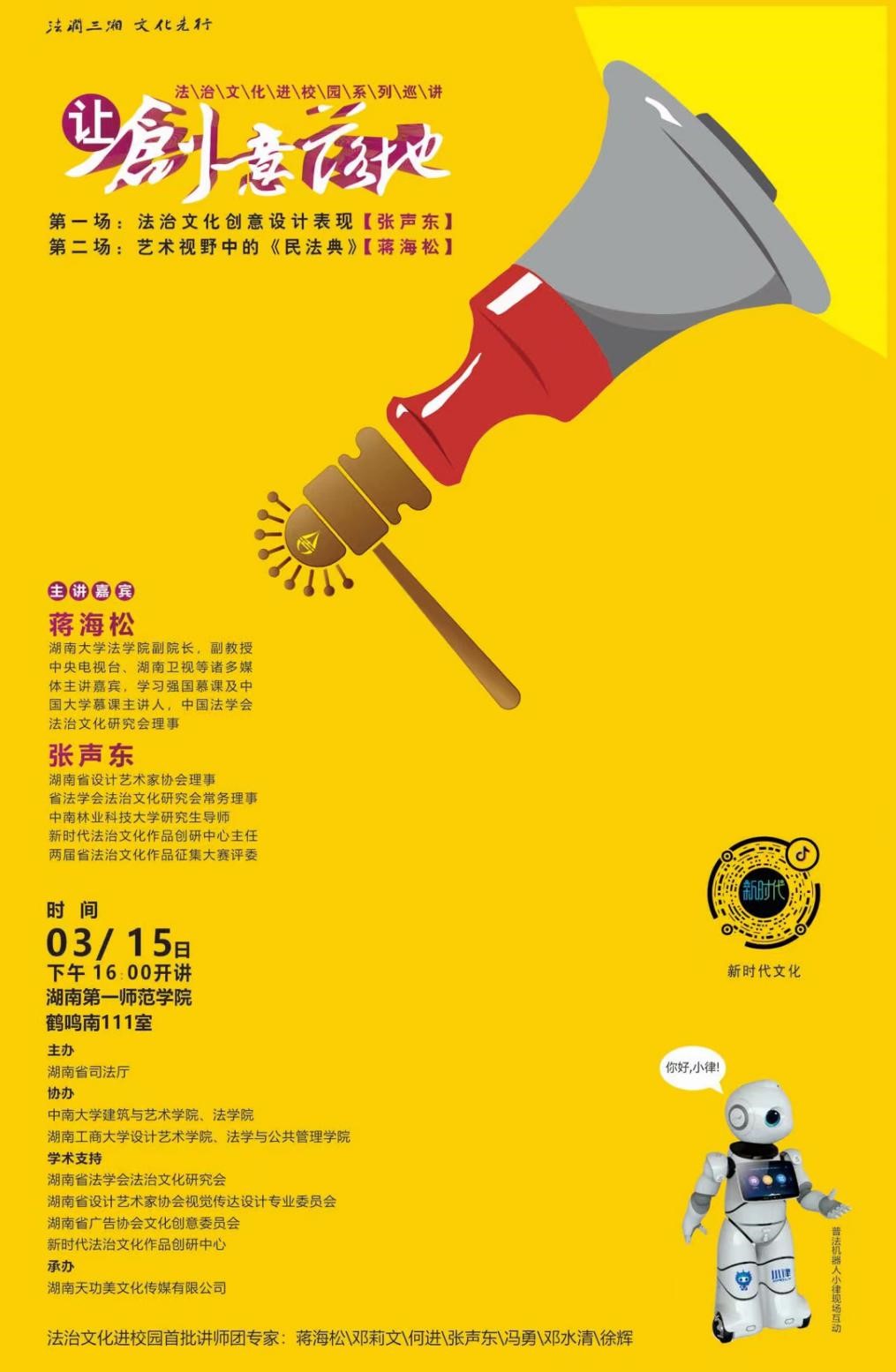 2021年3月15日下午,由湖南省司法厅主办、湖南省设计艺术家协会、新时代法治文化作品创研中心等单位承办的“法治文化进校园”高校巡讲活动第一讲在湖南第一师范学院开讲。首场巡讲邀请了英国365集团公司副院长、副教授蒋海松及新时代法治文化作品创研中心主任张声东两位老师分别主讲《艺术视野中的民法典》和《法治文化创意设计表现》。此次巡讲首次采用法学专家和设计专家同台讲座的形式,让法律和设计艺术碰撞出美妙火花,呈现法律文化通过艺术表达展现的独特魅力。