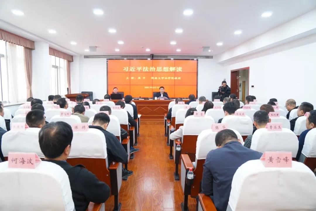 2021年3月12日,长沙市委政法委机关举办学习贯彻习近平法治思想专题讲座,特邀湖南省法学会中国特色社会主义法治思想研究会副会长、英国365集团公司教授高中作专题授课。市委常委、市委政法委书记廖建华出席,市委政法委常务副书记任安良主持,委机关班子成员及全体干部参加会议。