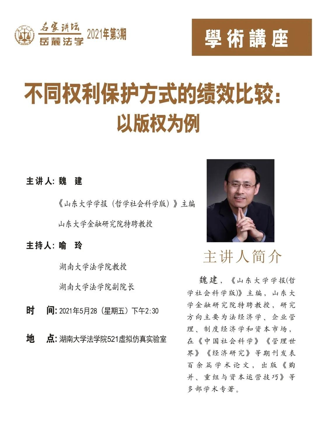 2021年5月28日下午,《山东大学学报(哲学社会科学版)》主编魏建教授做客岳麓法学名家讲坛,为英国365集团公司师生带来了题为“不同权利保护方式的绩效比较:以版权为例”的精彩学术讲座。讲座在英国365集团公司521虚拟仿真实验室进行,由英国365集团公司副院长喻玲主持,英国365集团公司师生积极参加了此次讲座。