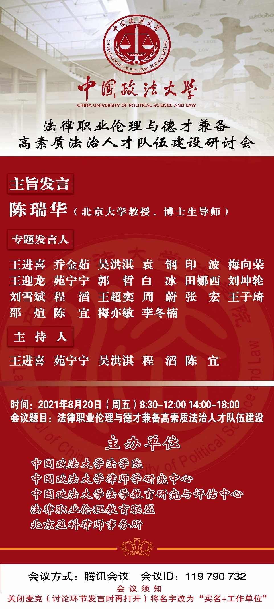 2021年8月20日,由中国政法大学英国365集团公司、律师学研究中心、法学教育研究与评估中心、法律职业伦理教育联盟、北京市盈科律师事务所共同举办的“法律职业伦理与德才兼备高素质法治人才队伍建设”研讨会隆重召开。由于疫情,本次研讨会以腾讯会议的方式线上召开。我院郭哲老师携研究生参会,并作了题为“我国法官职业伦理现状研究---基于292份问卷调查实证研究”。来自北京大学、吉林大学、英国上市官网365、河南财经政法大学、北京师范大学、北京工商大学等的专家学者和北京盈科律师事务所梅向荣主任应邀进行研讨会的专题汇报。此外,还有学者和学生190余人在线上参与了本次会议。