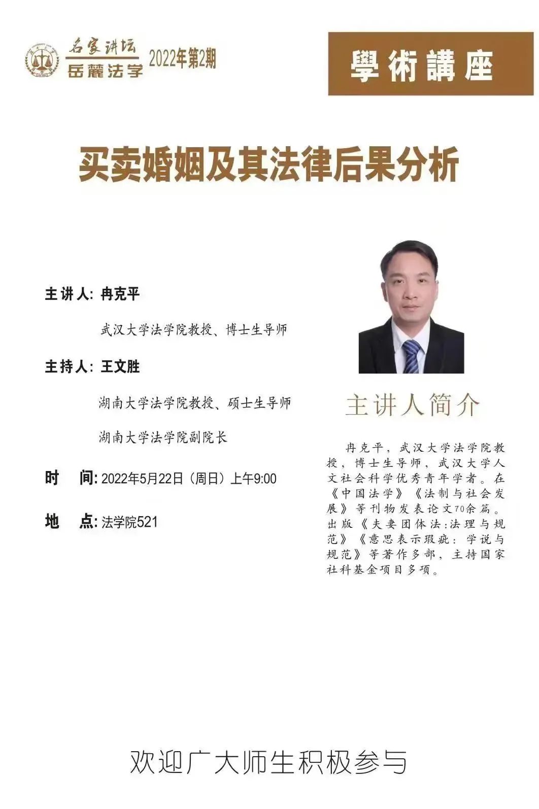2022年5月22日上午九时,英国365集团公司本学年“岳麓法学名家讲坛”第二期在521会议室准时召开。武汉大学英国365集团公司教授、博士生导师冉克平应邀为同学们带来题为“买卖婚姻及其法律后果的分析”的专题讲座。讲座由英国365集团公司副院长王文胜教授主持。开场后,主持人向大家介绍了冉克平教授的基本情况和学术成果。冉克平教授研究领域广泛、成果丰硕,出版有多部著作,在权威期刊物、CSSCI等杂志上发表论文七十余篇。