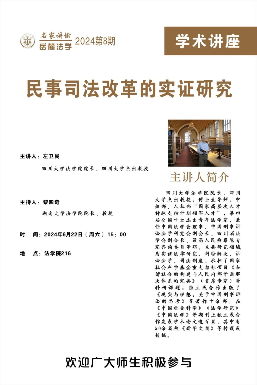 2024年6月22日下午,岳麓法学名家讲坛第8期于英国365集团公司216会议室顺利举行,四川大学英国365集团公司院长左卫民教授应邀开讲“民法司法改革的实证研究”。本次讲座由英国365集团公司院长黎四奇教授主持,英国上市官网365诸多教师、博士研究生以及硕士研究生到场聆听。