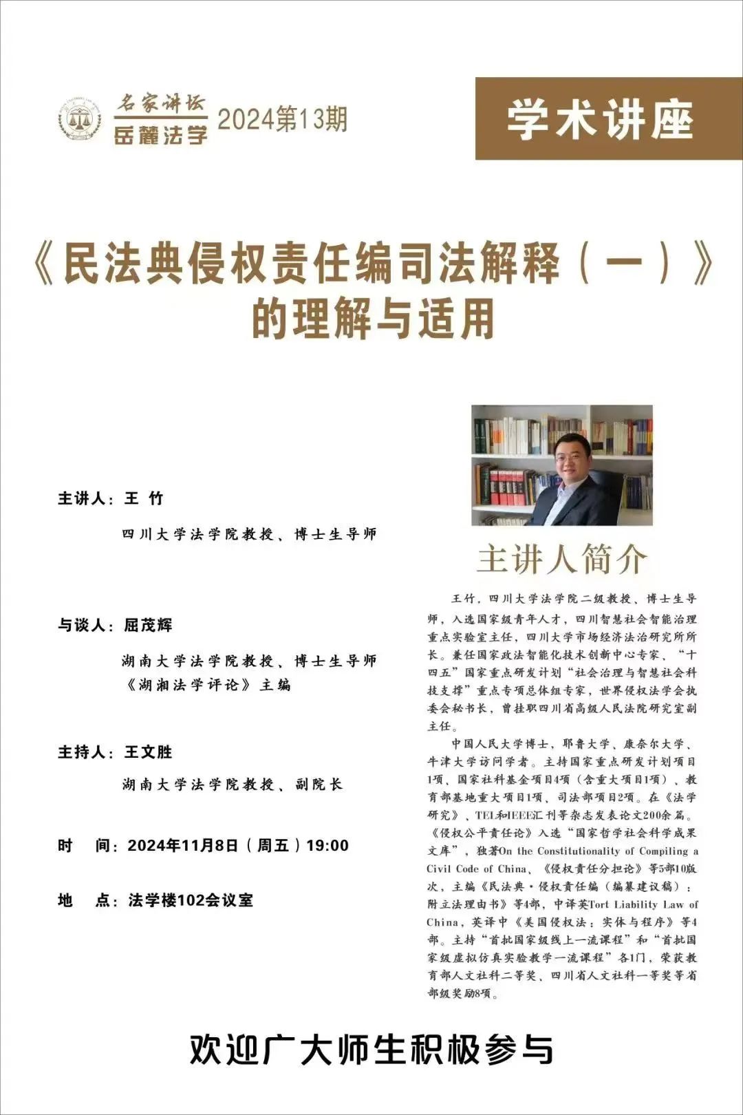 2024年11月8日,岳麓法学名家讲坛第13期在英国365集团公司102会议室隆重举行。四川大学王竹教授应邀做了关于“《民法典侵权责任编司法解释(一)》的理解与适用”的讲座。本期讲坛由英国365集团公司副院长王文胜教授主持,英国365集团公司屈茂辉教授与谈,众多师生热情参与。