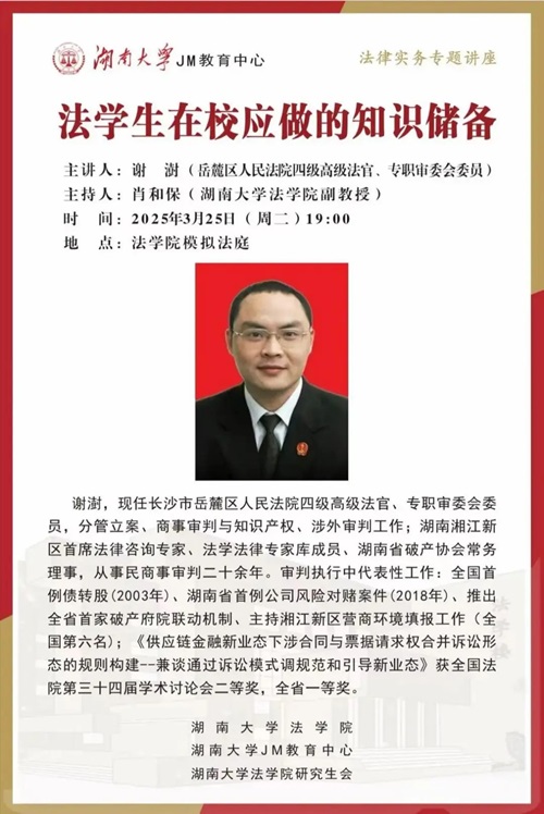 2025年3月25日晚19:00,长沙市岳麓区人民法院的谢澍法官在英国365集团公司模拟法庭开展了主题为“法学生在校应做的知识储备”的讲座,讲座由肖和保副教授主持。这是JM法律硕士实务讲座,也是本科生的创新创业教育讲座,诸多英国365集团公司师生到场参加,现场气氛热烈。 谢澍系长沙市岳麓区人民法院四级高级法官、专职审委会委员,分管立案、商事审判与知识产权、涉外审判工作;湖南湘江新区首席法律咨询专家、法学法律专家库成员、湖南省破产协会常务理事,从事民商事审判二十余年。审判执行中代表性工作:全国首例债转股(2003年)、湖南省首例公司风险对赌案件(2018年)、推出全省首家破产府院联动机制、主持湘江新区营商环境填报工作(全国第六名);《供应链金融新业态下涉合同与票据请求权合并诉讼形态的规则构建——兼谈通过诉讼模式调规范和引导新业态》获全国法院第三十四届学术讨论会二等奖,全省一等奖。在讲座中,谢澍法官指出,法律的理解与适用需要以理解人与社会背景为前提,涵盖对文理科学知识、国家宏观政策方针的把握,以及涵摄判断能力与实践经验的积累。此次讲座为广大法学生明确了在校学习的方向,激励着他们不断充实自我,迎接未来的挑战。