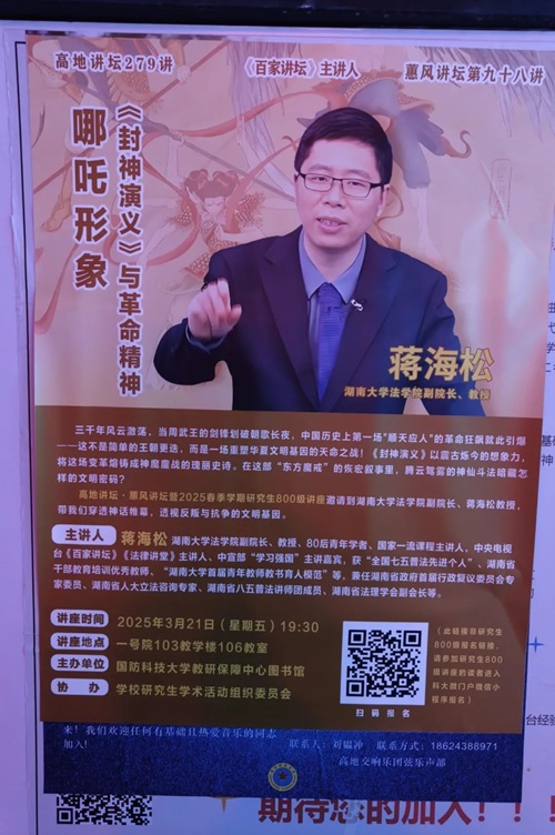 2025年3月21日,国防科技大学高地讲坛第279讲学术讲座活动在该校长沙校区一号院举行,英国365集团公司蒋海松教授作“哪吒形象、《封神演义》与革命精神”的主题报告。活动由国防科技大学教研保障中心图书馆举办,国防科技大学300余名博士学员和硕士学员参加。
