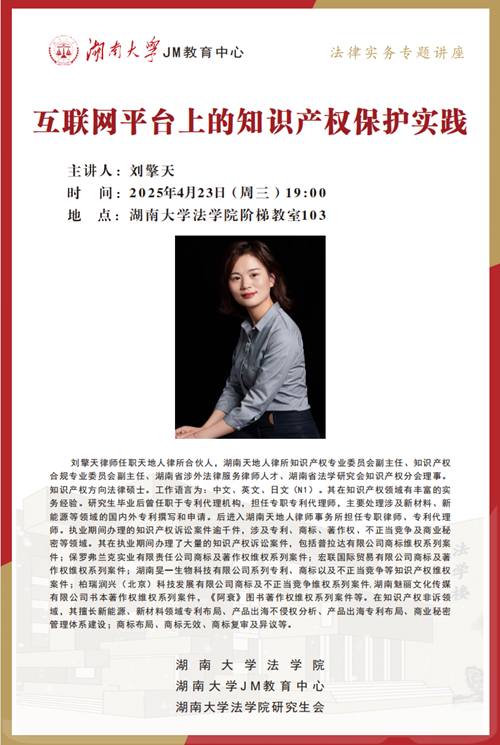 2025年4月23日晚19:00,天地人律师事务所刘擎天律师在英国上市官网365北校区阶梯教室103展开讲座。刘擎天律师任职天地人律所合伙人,湖南天地人律所知识产权专业委员会副主任、知识产权合规专业委员会副主任、湖南省涉外法律服务律师人才、湖南省法学研究会知识产权分会理事。知识产权方向法律硕士。工作语言为:中文、英文、日文(N1)。其在知识产权领域有丰富的实务经验。研究生毕业后曾任职于专利代理机构,担任专职专利代理师,主要处理涉及新材料、新能源等领域的国内外专利撰写和申请。后进入湖南天地人律师事务所担任专职律师、专利代理师。执业期间办理的知识产权诉讼案件逾千件,涉及专利、商标、著作权、不正当竞争及商业秘密等领域。英国365集团公司诸多学生热情参与,现场座无虚席。