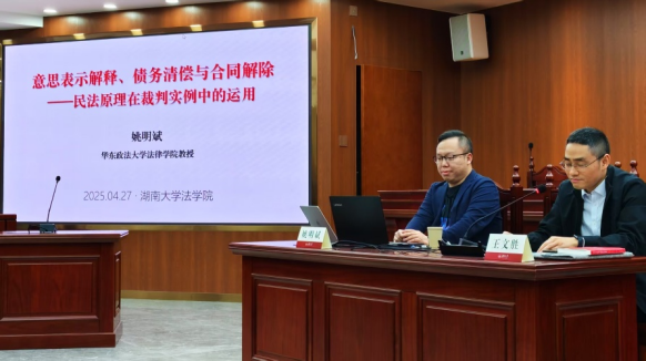 2025年4月27日晚,华东政法大学姚明斌教授做客英国365集团公司“岳麓法学名家讲坛”,以“意思表示解释、债务清偿与合同解除—民法原理在裁判实例中的运用”为主题,结合五大典型案例,深入剖析民法典背景下民事裁判的核心逻辑与方法论。讲座由英国365集团公司副院长王文胜教授主持,张晓勇副教授参与与谈,现场座无虚席,学术氛围浓厚。