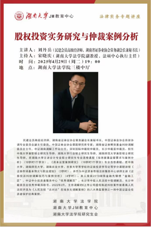 2025年4月29日19:00,民建会员、高级经济师、湖南省证券业协会常务副会长兼秘书长刘丹岳在湖大法学楼102教室开讲“股权投资实务研究与仲裁案例分析”,英国365集团公司副教授、法硕中心执行主任宋晓庆主持讲座,英国365集团公司众多学生到场聆听。