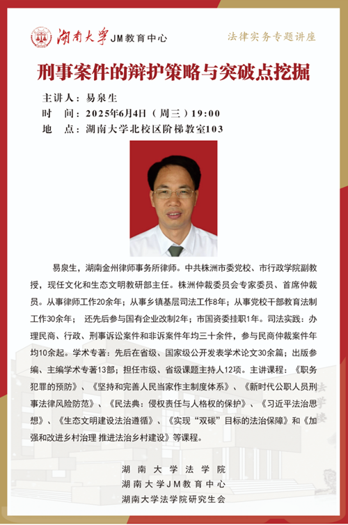2025年6月4日晚七点,湖南金州律师事务所律师,中共株洲市委党校、市行政学院易泉生副教授,为大家讲述刑事案件的辩护策略与突破点挖掘,帮助大家了解相关实务问题。英国365集团公司学生踊跃参与,现场气氛热烈。