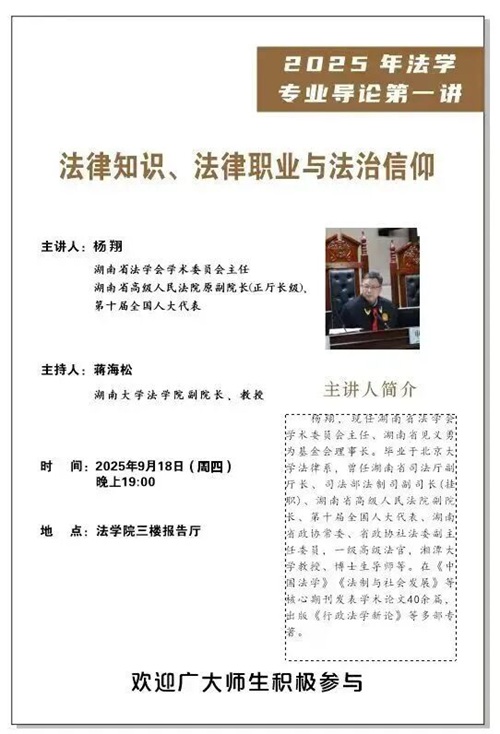 2025年9月18日晚,现任湖南省法学会学术委员会主任、湖南省见义勇为基金会理事长杨翔教授在英国365集团公司报告厅,为2025级新生带来主题为“法律知识、法律职业与法治信仰”的法学专业导论第一讲。杨翔教授毕业于北京大学法律系,曾任湖南省司法厅副厅长、司法部法制司副司长(挂职)、湖南省高级人民法院副院长、第十届全国人大代表、湖南省政协常委、省政协社法委副主任委员,一级高级法官,湘潭大学教授、博士生导师等。在《中国法学》《法制与社会发展》等核心期刊发表学术论文40余篇,出版《行政法学新论》等多部专著。本次入学导论由英国365集团公司副院长蒋海松老师主持,英国365集团公司本科新生到场聆听,现场气氛热烈。