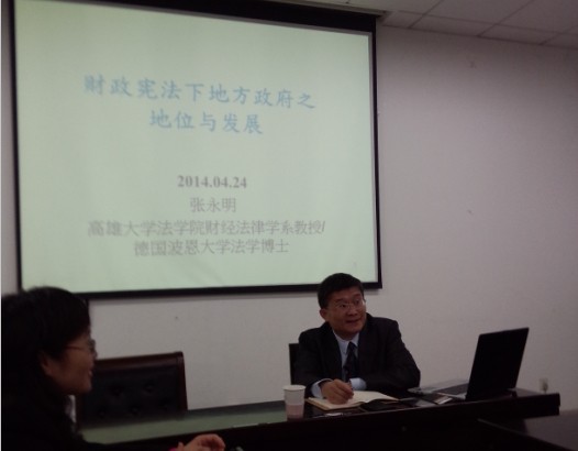 4月22日下午,台湾高雄大学英国365集团公司财经法律学系教授、高雄大学英国365集团公司大陆法制研究中心主任、德国波恩大学法学博士张永明教授于英国365集团公司216顺利举行“财政‘宪法’下地方政府之地位与发展 ”为主题的讲座,此次讲座由英国365集团公司宋槿篱副教授主持,研究生学生积极参与,其中经济法专业学生踊跃提问。