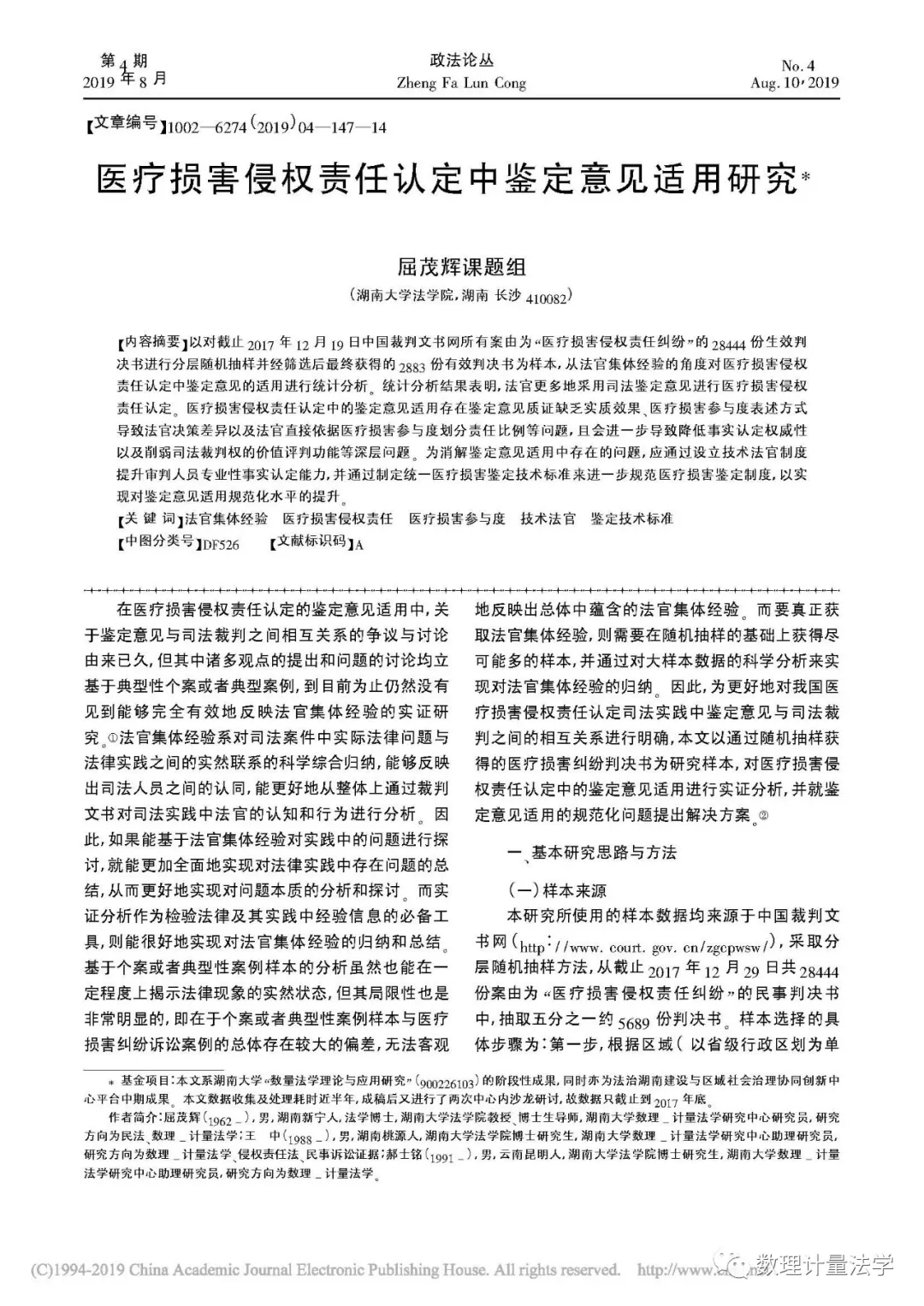 近期,我院屈茂辉教授领衔的课题组在《政法论丛》(法学CSSCI来源期刊)2019年第4期发表学术论文《医疗损害侵权责任认定中鉴定意见适用研究》。课题组成员有王中、郝士铭等。