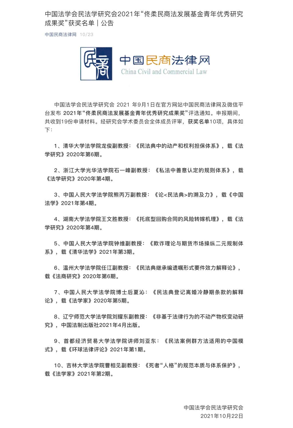 “佟柔民商法发展基金青年优秀研究成果奖”系为纪念中国民商法学奠基人佟柔教授而设立,由中国民法学研究会和佟柔民商法发展基金共同组织评选,面向40周岁以下的优秀青年学者,旨在鼓励青年民商学者潜心学术研究,促进我国民商事法学研究的繁荣和发展。经研究会学术委员会全体成员评审,2021年“佟柔民商法发展基金青年优秀研究成果奖”最终评出获奖作品共10项。