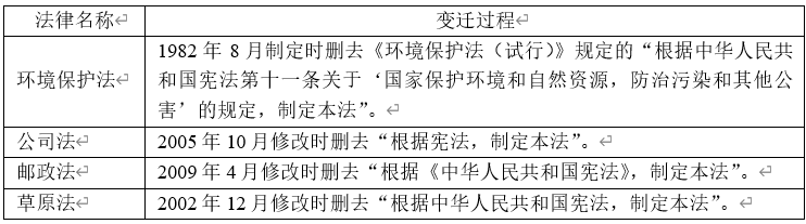 表2中的4部法律在制定时本来明确了立法根据,待到之后修改时却把立法根据条款删去了。背后的原因是多方面的,既有可能是立法根据发生了变化,比如1989年12月通过的《环境保护法》,是全国人大常委会在《环境保护法(试行)》的基础上修改而成的,在此过程中删去立法根据,是由于“环保法(试行)是依据1978年宪法第十一条制定的”,“因此,环境保护法的立法依据发生了变化”。也有可能是法律起草者认为不必规定立法根据,比如全国人大常委会2005年10月修改《公司法》时删去“根据宪法”的内容,是考虑到“一切法律、法规、规章都不得与宪法相抵触,所以没有必要每一部法律中都要规定‘根据宪法’的内容”。当然,即使删去了“立法根据条款”,原有的立法根据依然可在事实上发挥根据的作用。例如,1986年12月通过的《邮政法》规定“根据《中华人民共和国宪法》,制定本法”,《宪法》的根据作用就包括“依据《宪法》关于公民通信自由和通信秘密受法律保护的规定,对公民的通信权利给予了充分的尊重和切实的法律保护。”即便2009年4月修改《邮政法》时删去了上述立法根据,但现行《邮政法》仍然在第1条把“保护通信自由和通信秘密”规定为立法目的。