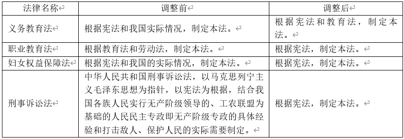 此外,在一些法律修改过程中,立法根据条款的内容会发生改变,由此使得法律的性质和定位有所调整。例如,全国人大常委会1996年5月制定的《职业教育法》,把《教育法》和《劳动法》作为立法根据,这是考虑到“职业教育法是教育法的配套法律,同时又与实施劳动法关于职业培训的内容有着密切的联系”。待到2022年4月,全国人大常委会对《职业教育法》进行修改,在《职业教育法(修订草案)》当中,立法根据增加了《宪法》,但最终审议通过的《职业教育法》仅在立法根据条款中保留了《宪法》,此前的《教育法》和《劳动法》均被删去。对于立法根据的此般调整,有论者认为修订后的《职业教育法》“在法律地位上与教育法并列,意味着国家教育基本制度独立出一个新的体系”。当然,法律的性质和定位根源于法律调整的事项,《职业教育法》定位的上述调整,同样是因为职业教育在整个教育体系中定位的变化,即职业教育被摆在与普通教育同等重要的地位,这“改变了职业教育在整个‘大教育’体系中的定位”,规范职业教育活动的《职业教育法》也应随之调整。