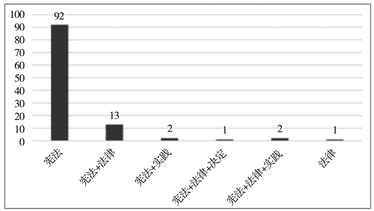 对于“立法以何为据”的问题,当立法者决定在法律文本中设定立法根据条款之后,随即而来的问题便是,应当选择哪些内容作为立法根据。由图3可以看出,在现行有效的法律当中,有关立法根据条款内容的规定也不尽相同。