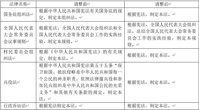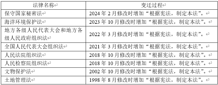 相较于前述三类变迁而言,表4中的5部法律只是立法根据条款表述略微有所调整,并无多少实质性的变化,而此类变化又大多缘于立法技术规范的要求。例如,当《宪法》被载入立法根据条款时,其表述不再是“《中华人民共和国宪法》”而是“宪法”。特别是全国人大常委会法制工作委员会2009年10月印发的《立法技术规范(试行)(一)》明确要求,“引用《中华人民共和国宪法》时,不用全称,也不加书名号,直接表述为‘宪法’。”再如,当《宪法》或法律成为立法根据时,不再援引具体条款,而是笼统地把《宪法》或者某部法律作为立法根据。