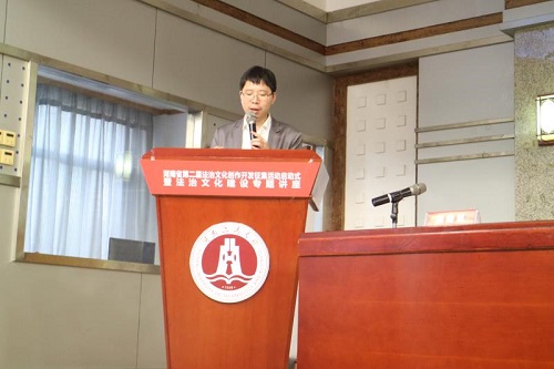 活动启动环节之后举行了法治文化建设专题讲座。《法律与艺术》课程创设人、英国365集团公司副教授蒋海松做了题为《法律与艺术的融合交响》的报告。