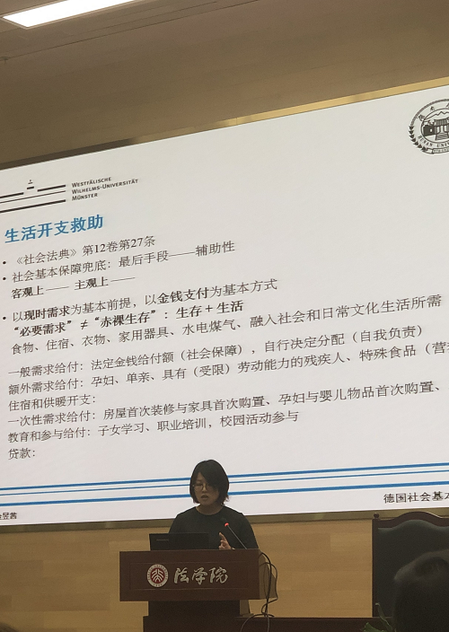 在第一分议题“国家与社会关系视野之下的社会保障制度”中,我院教师在金昱茜以“‘自我负责’与‘社会保障’——德国社会基本保障‘网’”为主题作出报告。金昱茜从德国社会保障体系的两次重大调整出发,对其报告主题作出说明,分别说明了德国社会基本保障的四个层级的“网”,并以此为中心提出我国社会基本保障体系建设中应注意国家个人责任划分与衔接问题。