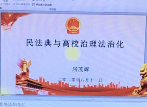 在讲座中,屈茂辉教授深刻阐述了民法典的重大意义和地位作用,透彻分析了民法典的创新与特色,聚焦民法典核心要义和重点问题,深入解读了民法典基本原则、要求,以及民法典实施与高校治理法治化之间的关系。屈茂辉指出,民法典是新中国第一部以法典命名的法律,是推进全面依法治国、加快建设社会主义法治国家的重大举措,是推进国家治理体系和治理能力现代化的重大举措。教育工作者应当认真学习掌握民法典规定,依法履行职能、行使职权,保护民事权利不受侵犯、促进高校治理的法治化规范化。