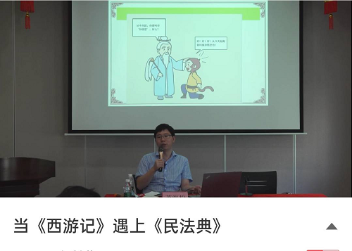 2020年8月6日下午,由深圳市大鹏新区政法办主办、葵涌办事处平安建设办(司法所)承办的《当<西游记>遇上民法典》法律知识专题宣讲活动在大鹏新区党群服务中心党建书吧精彩开讲,活动特别邀请了中国大学慕课《法说西游记》主讲人蒋海松副教授对辖区青少年及家长开展法治宣传教育活动。蒋海松结合《西游记》故事,对民法典的重要条文和民法原则进行趣味化讲解,在场孩子们听得津津有味。