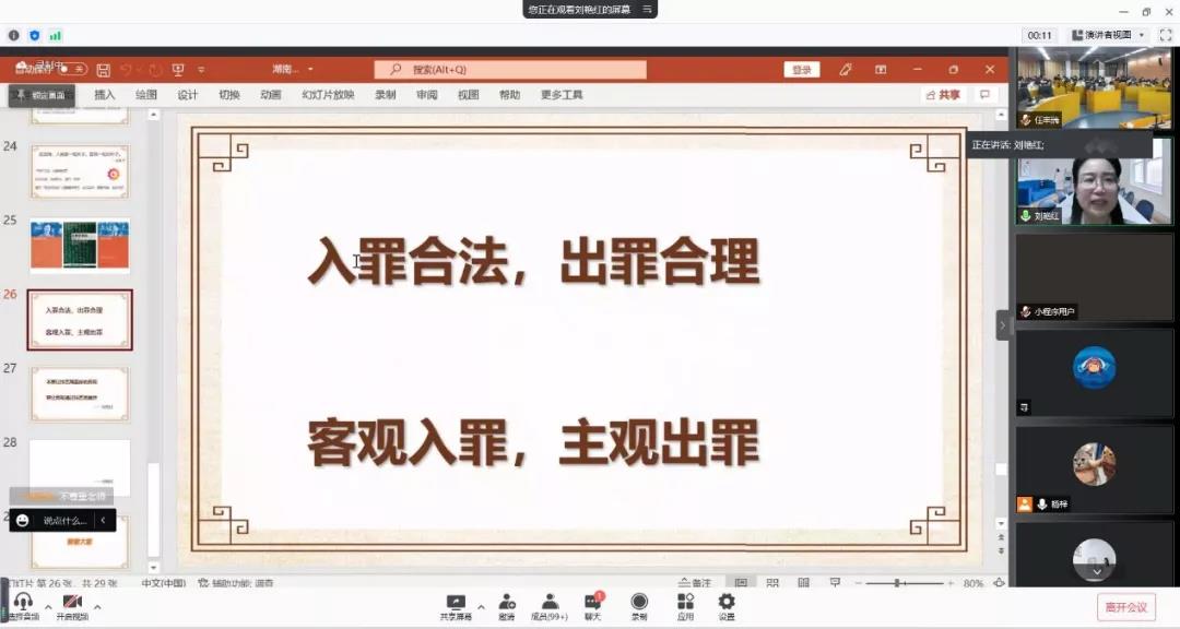 活动伊始,刘老师从“男子偷割韭菜获利8元判刑半年”“博士偷菜案”到“醉酒挪车案”等众多让“吃瓜群众”操碎了心的案件切入,用风趣幽默的语言启发同学们对刑事司法实务现状展开思考,并提出“是否存在刑法良知”这一发人深省的问题。她指出,“定罪处罚须有法可依”,并从轻罪入刑、轻罪司法化等角度比较中西方法律文化、法治资源、程序法等的不同,由浅入深,娓娓道来,引发同学们的强烈反响和积极思考。